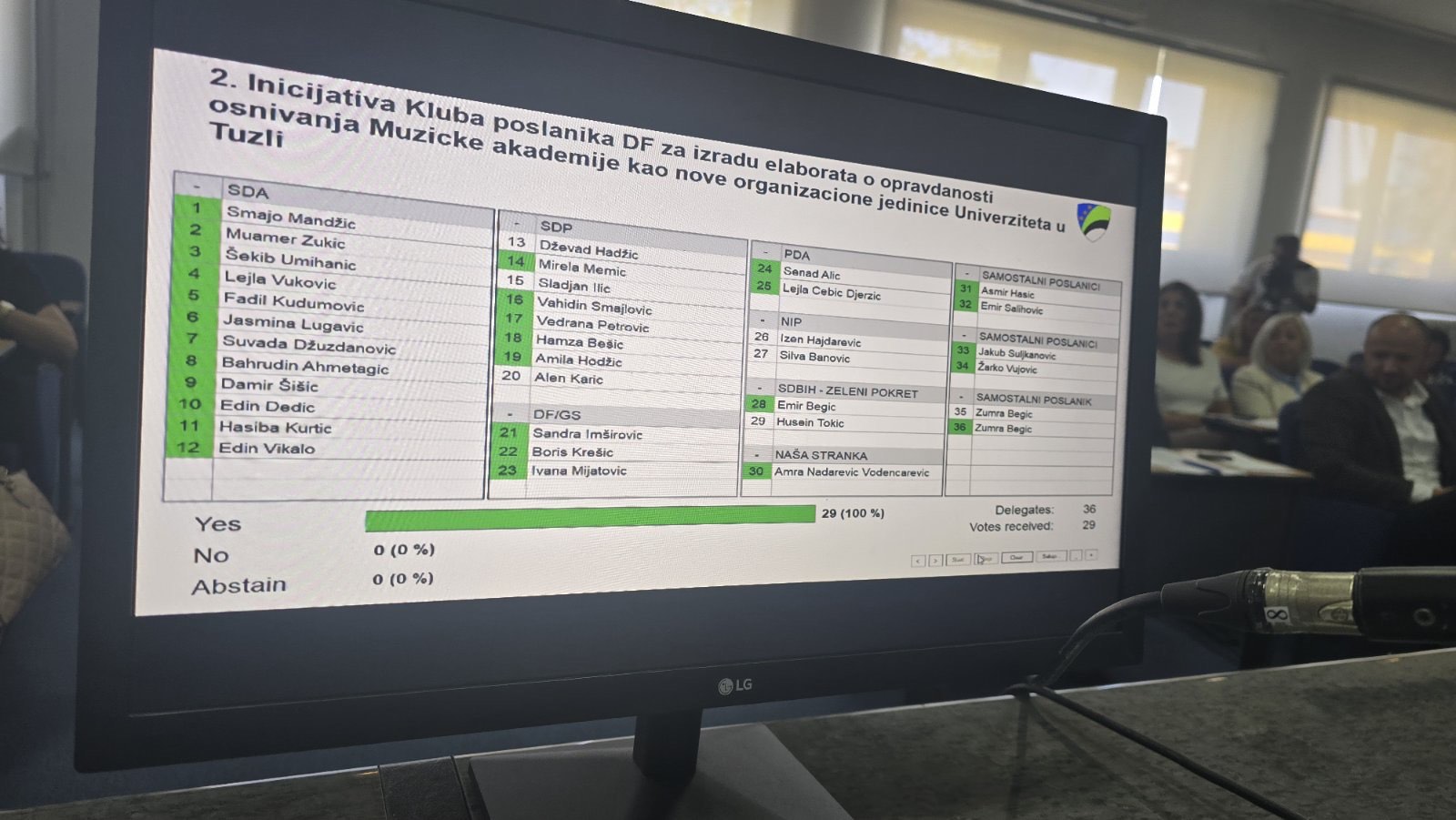 Na sjednici Skupštine Tuzlanskog kantona usvojena je inicijativa Kluba zastupnika Demokratske fronte kojom se zadužuje Vlada TK, Ministarstvo obrazovanja i nauke te Univerzitet u Tuzli da pristupe izradi Elaborata o opravdanosti osnivanja Muzičke akademije kao nove organizacione jedinice Univerziteta u Tuzli.